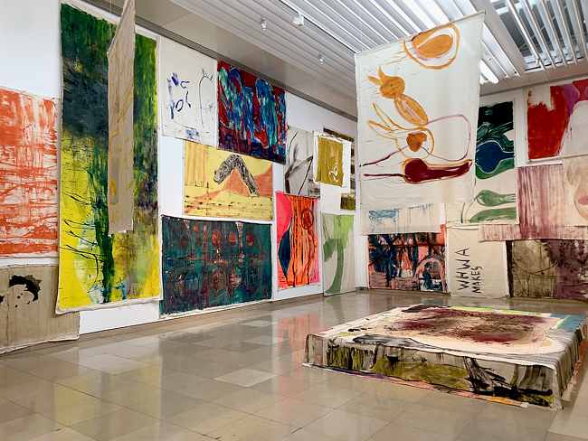 La liberté n’est qu’une action à l’image d’un mot, coupé en deux, peint sur une toile « ABSTR-ACTION ». On peut y lire un second à l’autre bout de l’exposition à côté d’un acronyme « WHWA MAKES ». Faire une action, ce n’est pas d’expressionnisme dont il est question, mais de l’expression que Spinoza utilisait « pour exposer la puissance ». L’expression n’est pas création, c’est d’abord s’arracher à des passions tristes. Dans l’exposition quelque chose nous retient dans ce sens dessous-dessus sans nous attacher, sans nous dominer même si l’exposition est colossale, sans porter un seul jugement.