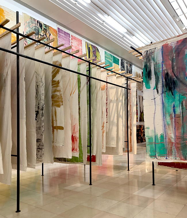 Sans doute Vivian Suter, qui parle peu dans un filet de voix, accepte le terme de « paysage » pour définir son travail, mais sommes-nous vraiment devant ou dans un paysage parce qu’on voit de supposés troncs d’arbres, une floraison de couleurs ou parce que les toiles suspendues à des racks jouent un ramage à travers lequel vibre la lumière ? La réponse est négative, nous sommes face à ce qui demeure : à voir le nombre de formes circulaires qui reviennent de toile en toile, cela saute aux yeux, elles sont à la taille de son corps, à la longueur de son bras selon que son angle est grand ou petit. À chaque fois c’est ce corps qui revient avec des cercles, des coulures, des lignes. Ce qui demeure est un geste humain qui n’est pas moins puissance de pouvoir tout mettre en vrac et de n’avoir rien à faire du haut et du bas de l’œuvre. C’est une puissance qui rappelle la phrase de Paul Valéry « il faut se proposer un but impossible » au même titre que les dégâts d’un ouragan : c’est phénoménal ! Il faut l’entendre selon une langue intellectuelle et une autre vulgaire. C’est une phénoménologie qui convoque une expérience vécue de la perception, et l’injonction d’une apparition remarquable et unique. Peu importe en définitive l’importance de la trouvaille dite picturale, ce qui compte c’est la difficulté vaincue qui se manifeste par trois principes : pas de titre, pas de date, pas de sens d’accrochage. Rien ne peut empêcher d’apprendre à voir dans tous les sens, hors des sentiers rebattus de la connaissance. Cette difficulté vaincue est une liberté. Sans doute la cherchons-nous toujours avec beaucoup d’insistance, et se fait grosse de notre impuissance à l’appeler. Mais on se souviendra qu’elle ne se conquiert que contre ce qui la nie, et qu’une fois vécue on ne l’oublie plus. C’est cela le geste de Vivian Suter qui se transfère en action pour le spectateur : ce qu’il perçoit sans certitude du sens, de représentation, de reconnaissance, c’est qu’il est infiniment pris par la liberté d’une puissance dont il n’aura pas assez de plusieurs mots pour la définir.