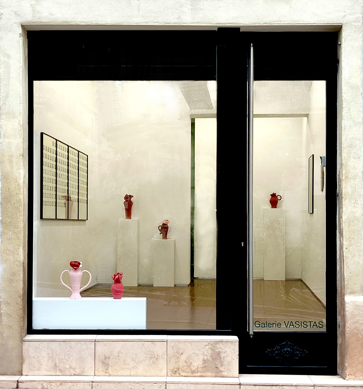 Par la vitrine de Vasistas on voit, en face, au 14 de la rue Foch, l’entrée de l’élégante boutique agnès b. C’est en son sous-sol que se trouve la galerie qui accueille actuellement Eléna Salah jusqu’au 25 octobre.